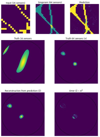 Results obtained with the data from the simulation. The top left image is 16 sensors simulation of measurement. The top middle is a sinogram obtained from 64 sensor measurements. The top right predicts 64 sensor sinograms from 16 sensor measurements. The middle left is a Reconstruction from 16 sensor measurement data, middle right is a reconstruction from 64 sensor measurement data. The bottom left is a reconstruction from the prediction, bottom right is an error between reconstruction from prediction and truth x.