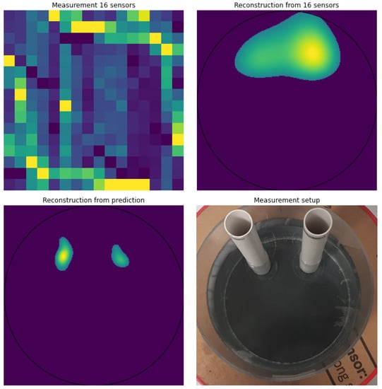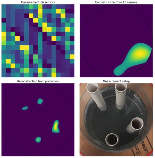 The top left panel of Figure 7 shows the real measurement. The top right panel of the Figure shows the reconstruction obtained with the Radon method. The bottom left panel shows the reconstruction with the data predicted with the model, and the bottom right panel shows the measurement setup. The position of the top left phantom seen in Figure 7 is not correctly recognized, but the position of 3 out of 4 phantoms is correct.