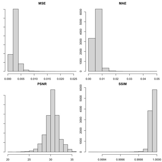 Four well-known indicators were used to assess the quality of the reconstruction: Mean Absolute Error (MAE), Mean Square Error (MSE), Peak Signal to Noise Ratio (PSNR), and structural similarity index measure (SSIM). The MSE metric was evaluated according to the equation:
