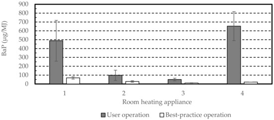 Average benzo(a)pyrene emissions of three batches of four room-heating appliances (1, 2, 4: chimney stoves, 3: tiled stove) when operated according to users’ own habits and according to best-practice heating operation. Error bars represent the standard deviation of measurements. Own figure, based on data of [32].
