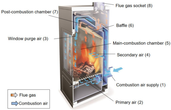 An important non-technical approach to improve the real-life operating performance of stoves is the optimization of user behavior, which is known as a crucial factor influencing emissions in real-life operation [7,8]. However, several new technological measures have also been developed recently that aim to improve appliance performance in terms of emissions and efficiency.