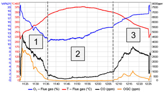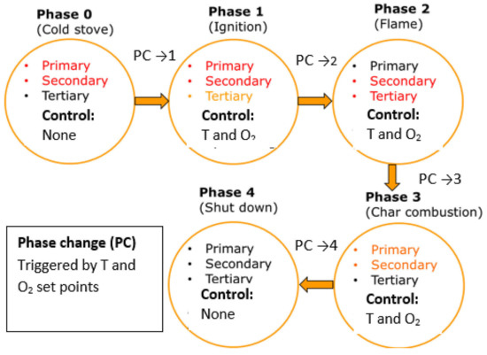 Challenging factors for the best possible application of the 3T principles are the high share of transient phases during batch-wise combustion, as well as cold start and cooling-down conditions at the beginning and end of heating operations. Furthermore, it is necessary to consider that local conditions may differ within the combustion chamber and that the operation by the user, e.g., operating errors, may have an important impact on combustion quality [7,8].
