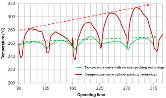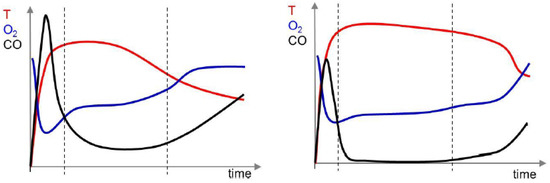 In real-life operation, users recharge a new fuel batch either when the flames are gone or when only a few flames are still visible [11,12]. In principle, this habit corresponds with general recommendations about “correct heating” and was also confirmed as the best time for recharging during comparative combustion tests [7]. In cases of recharging too late, i.e., when the flames have already been gone for a longer time and the stove as well as the firebed have already cooled down, smoldering combustion conditions occur, which are linked to significantly increased gaseous and particulate emissions [7,8].