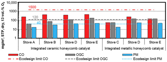 - Reichert, G.; Schmidl, C.; Haslinger, W.; Stressler, H.; Sturmlechner, R.; Schwabl, M.; Wöhler, M.; Hochenauer, C. Impact of oxidizing honeycomb catalysts integrated in firewood stoves on emissions under real-life operating conditions. Fuel Process. Technol. 2018, 177, 109–118. [Google Scholar] [CrossRef]