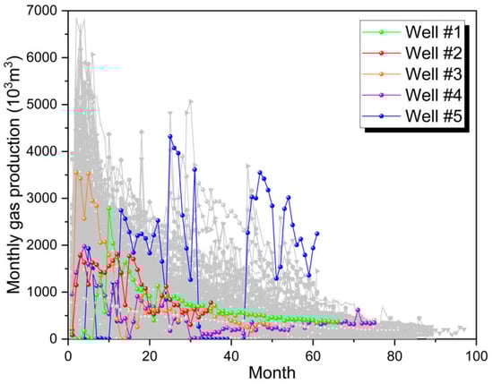 In fact, predicting production dynamics with acceptable accuracy is of greater importance to reservoir operators, and production curve estimation is also a more challenging problem than predicting a single point (i.e., the cumulative production). As shown in Figure 1, the monthly well production in unconventional reservoirs fluctuates greatly due to the frequent shut-in operation, which grows the complexity of applying ML methods to deal with production sequences. The autoregressive strategy is widely used in time series analysis [36,37,38], i.e., to predict future values based on past values. For example, Duan et al. [25] integrated the autoregressive integral moving average (ARIMA) model and RTS smoothing to predict gas well production. Fan et al. [26] proposed a combined model to capture the linear component by ARIMA and the nonlinear part of the daily production sequence through a Long Short-Term Memory (LSTM) network separately. In addition, the specific architectures of recurrent neural networks (RNNs), such as LSTM and encoder–decoder architectures, render them inherently appropriate for modelling sequential information, such as monthly production and bottom hole pressures (BHP). A particle swarm optimization-assisted LSTM model was proposed by Song et al. [27] to infer the daily oil rate of fractured horizontal wells. Zha et al. [28] developed a CNN-LSTM model to extract important features automatically and capture the sequence dependence, which was used to predict monthly natural gas production with an MAPE of 7.7%. Moreover, in another study [39], short-term forecasts of oil production were demonstrated by DeepAR and Prophet time series analysis. The results imply that ML approaches could fail in capturing long-term trends and the data-driven models should be retrained regularly. Zhong et al. [40] used a conditional deep convolutional generative neural network and the material balance method to develop a proxy model for the assessment of the production rate for waterflooding as a function of permeability field and time. The results indicate that the predicted values of the proposed model match excellently with the outcomes of the commercial simulator.