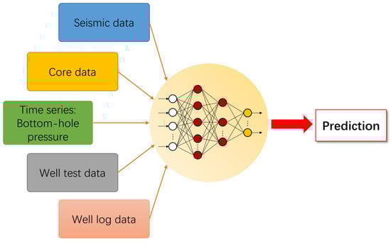 In reservoir engineering, data at different scales, in different domains and different formats, are accumulated, e.g., there is a large number of computerized tomography (CT) scans at the core scale, time series data such as monthly fluid production, and a wide variety of tabular data at the well scale. Different data sources have different resolutions and can provide different information. For instance, seismic data are available regarding large areas and can provide an evaluation of petrophysical properties across the entire reservoir, but they only carry limited information. Logging data have relatively high resolution but suffer from sparse, site-specific data issues. Core data provide the most accurate information and highest resolution, but their acquisition is limited and often prohibitively expensive. Therefore, fusing multiple input information methods with ML models is expected to improve the generalization of the models, enhance the resolution of the reservoir modelling and alleviate the bottleneck of data scarcity. Therefore, reasonable stack strategies of various modules or multimodal learning architectures are anticipated to become available in the near future to process various inputs simultaneously. Figure 2 shows an illustration of the integration of multiple data sources in reservoir engineering.