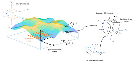 For a 2D analysis, the topographic surface is modelled as a long, traction-free crack aerially exposed due to the removal of overburden materials [18]. For a 3D analysis such as the one discussed in this research, we extend this definition to manifest the topographic surface with a group of connected, rectangular-shaped displacement discontinuity (DD) elements with traction-free boundary conditions under a gravity-induced stress state [17,42]. As shown in Figure 2, the global coordinate system is pointing towards east, south, and vertically upwards, respectively. The normal and shear ambient stresses with respect to the global coordinate system on and below the surface within the domain can be expressed as: