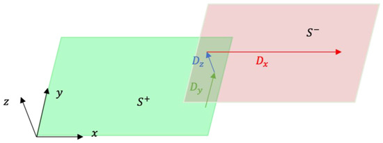 Using the elastic law as the foundation for the numerical computations of DDM, Crouch and Starfield [42] have derived a system of equations that relate the induced stresses at any given point in the interior body with the DD components on the boundary. As shown on the right-hand side of Figure 2, the DD element with a negligible thickness can be treated as two identical surfaces opposite to each other. The surface on top is denoted as and the surface at the bottom is denoted as , as illustrated in Figure 3.