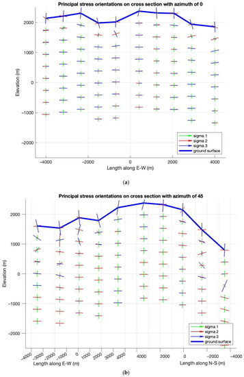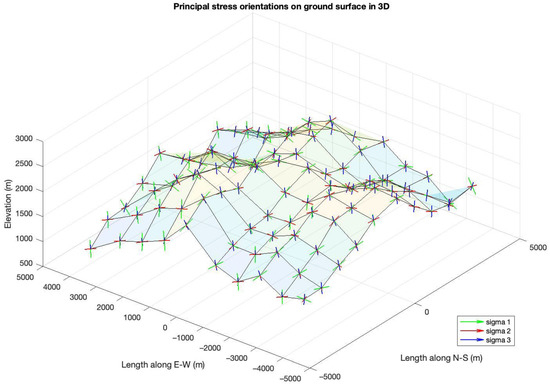 Figure 6 shows the principal stress directions on the topographic surface in 3D. It can be observed that the minimum principal stress, S3, is roughly perpendicular to the ground surface, which is consistent with the boundary condition of traction-free surface. No apparent trend is recognizable for the orientations of maximum () and minimum () horizontal stress on the surface. Note that this figure applies to both scenarios (with and without tectonic stress), since tectonic stresses are assumed to have no effect on the exposed elevated surface in the mountain range.