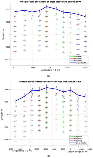 Orientation of principal stresses without tectonic stress in cross-section views with varying azimuth. (a) E-W; (b) NW-SW; (c) N-S; (d) NW-SE. All plots are drawn with unit vectors to represent the direction; the length is irrelevant to the magnitude. Locations of the cross sections are shown in Figure 5b.