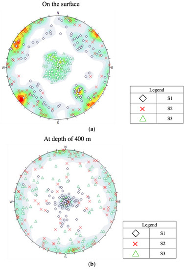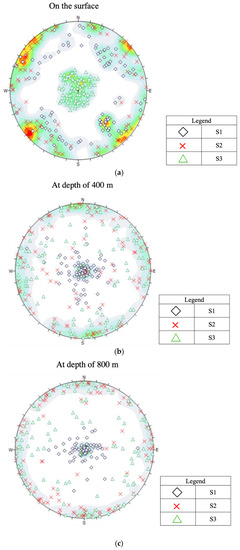 The stereographical diagrams in Figure 8 were plotted using the commercial software DIPS, a program designed to interactively analyze the orientation-based geological data input utilizing stereographic projection [48]. Each symbol on the 2D stereonet in Figure 8 indicates a line in 3D, representing one of the three directions of the principal stresses for each element, described by its trend and plunge.