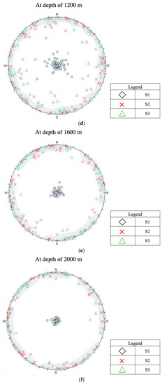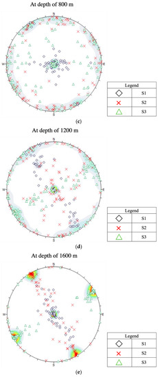The stereographical projections shown in Figure 10 suggest that the tectonic stresses contribute greatly toward the induced stress orientation at deeper depth, as and are roughly parallel with the directions of tectonic stresses. Again, the vertical stress is switching from S3 to S1 starting right below the surface where the stress induced by gravity dominates. Between the depth of approximately 1200 m to 1600 m, the influence of tectonic stress becomes stronger than the gravitational stress. Thus, S1 becomes parallel to either direction of major or minor horizontal stress, and the vertical stress becomes either S2 or S3. At depth deeper than 1800 m, the gravitational stress once again becomes the most dominant driving force of the total induced stresses, with vertical stress being S1. At depth of 3200 m and beyond, S1, S2, and S3 are almost perfectly aligned with the vertical direction and the orientations of major and minor horizontal stresses, respectively.