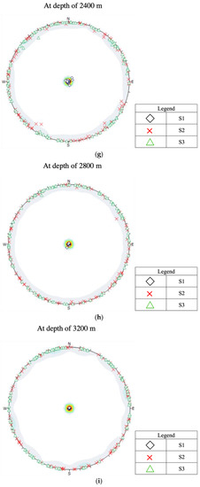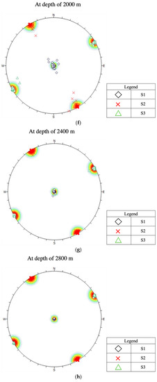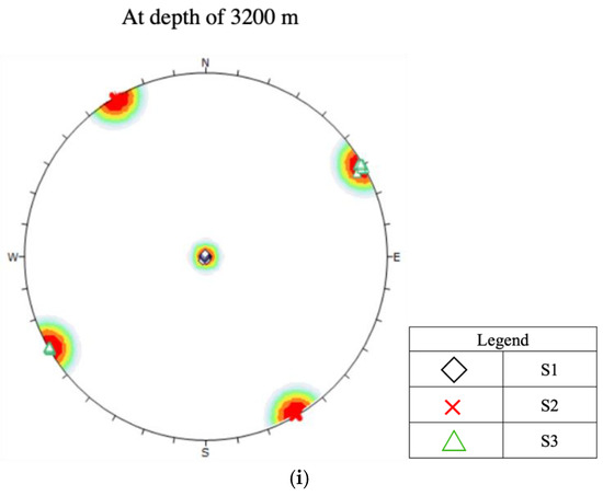 Stereographical projection of induced principal stress directions with tectonic stresses in the study area at depth of (a) 0 m; (b) 400 m; (c) 800 m; (d) 1200 m; (e) 1600 m; (f) 2000 m; (g) 2400 m; (h) 2800 m; (i) 3200 m.