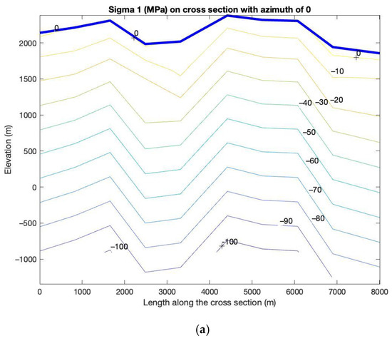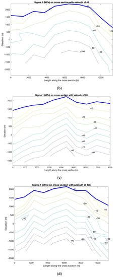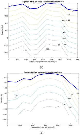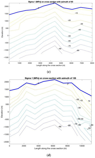 The contour of magnitudes for all three principal stresses on each layer mimics the topographic surface and remains almost unchanged in shape with decreasing elevation. As an example, the magnitude contour for S1 is plotted in four cross-sections with different directions in Figure 9. Note that compression is taken as negative in this study. Each contour line is roughly parallel with the topography with a constant increase in magnitude as the depth increases. Slight deviations between the magnitude and elevation contours are observed at the shallow depth due to the coarse precision of the numerical simulation. This minor discrepancy can be avoided by utilizing a finer grid of the boundary surface with a larger number of boundary elements. The same trend is observed for S2 and S3; additional plots are omitted for brevity.