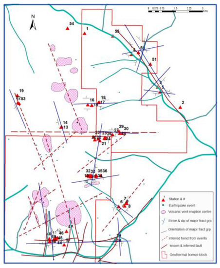 Orientations of major tectonic features interpreted from volcanic eruption center/vents, recorded earthquakes, and known and inferred faults from geophysical data and fracture strike groups. Figure modified from [50].