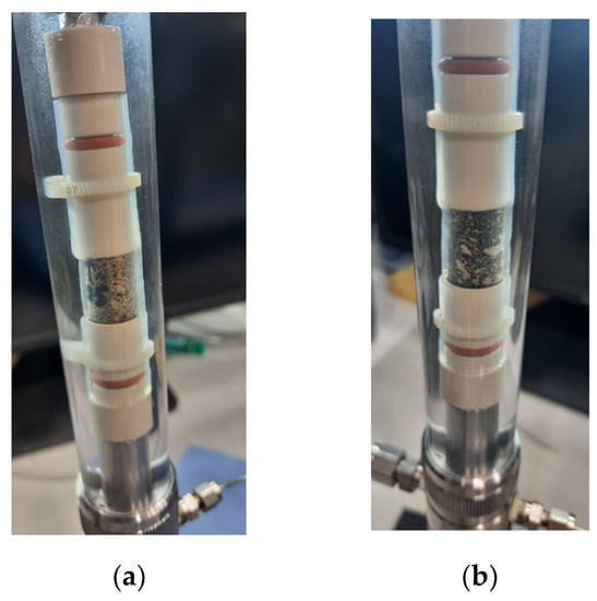 A core-flooding unit was used to pump fluids through the core holder, and to record the pressure drop for μCT experiments. Studies were carried out using a core holder (Figure 1), three high-pressure pumps, a differential pressure sensor, L-series fine-adjustment valves, and a computer control, together with the necessary signal converters. Fluid supply through the core holder was carried out by using pumps with an accurate fluid flow rate. To maintain pore pressure, a reverse pressure regulator (BPR) was used. To collect the volume of liquid fluids at the outlet, Duran 200 dm3 collecting tanks were used.