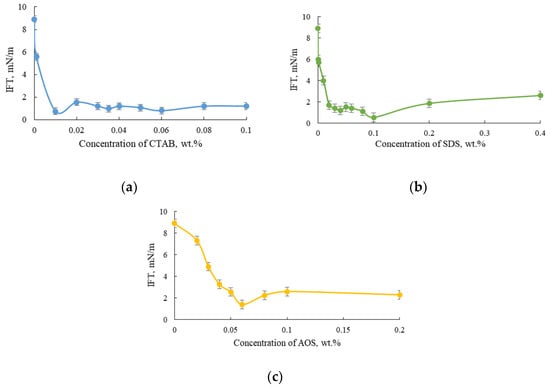 Therefore, before testing the effect of nanoparticles on the surfactants’ ability to reduce IFT, it is important to find the optimal surfactant concentration. For this purpose, the influence of surfactants (CTAB, SDS, and AOS) with different concentrations on oil–brine IFT was studied. The dependence of interfacial tension values of aqueous surfactant solutions on surfactant concentrations is shown in Figure 4. The concentration at which surfactants have minimum IFT values is known as the critical micelle concentration (CMC). The graphs show that the CMC values were 0.01 wt.% for CTAB, 0.1 wt.% for SDS, and 0.06 wt.% for AOS. The corresponding interfacial tension values at these surfactant concentrations were 0.74 ± 0.06 mN/m, 0.54 ± 0.04 mN/m, and 1.4 ± 0.12 mN/m, respectively. However, taking into account possible surfactant adsorption onto carbonate rocks, concentrations of 0.05 wt.% CTAB, 0.1 wt.% SDS, and 0.1 wt.% AOS were used in further experiments. Note that the IFT values at these concentrations were higher than at the CMC point, but were still low (~2 mN/m).