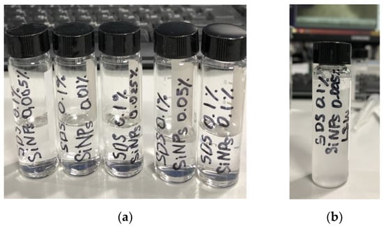 (a) The 0.1 wt.% SDS solutions with 0.005 wt.%, 0.01 wt.%, 0.025 wt.%, 0.05 wt.%, and 0.1 wt.% SiO2; (b) the 0.1 wt.% SDS solution with 0.005 wt.% SiO2 in LSW.