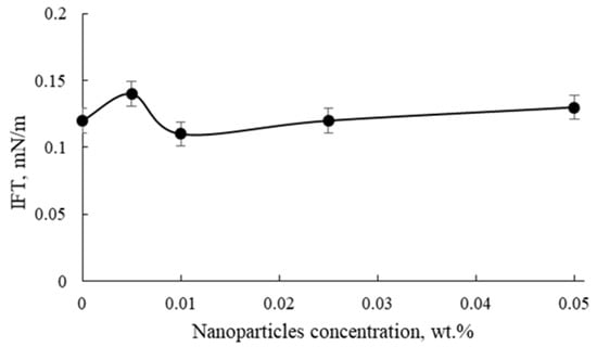 In Figure 7, the influence of different concentrations of nanoparticles on the IFT of 0.1 wt.% AOS with LSW is presented. As demonstrated, the addition of nanoparticles showed an insignificant effect on IFT in comparison with the addition of salts (NaCl, MgCl2, CaCl2, and Na2SO4), illustrating that salt ions have a more pronounced influence on IFT than NPs. The same results were obtained in other works [20,33], where the IFT of surfactants was studied with the addition of different nanoparticle concentrations. The authors [33] stated that the CMC of SDS was strongly influenced by salt concentrations, while the CMC was only slightly affected by SiO2 nanoparticles. Moreover, the authors reported that the synergism of IFT reduction of surfactants and NPs can be achieved at particular NP concentrations that are usually small and do not exceed 0.1–0.3 wt.%. However, reservoir brine consists of high salt concentrations, and thus the influence of salt ions on nanofluids should be tested in order to realistically mimic the nanofluids’ behavior under reservoir conditions.