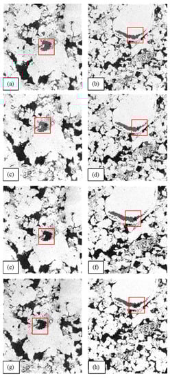 The images of core sample slices obtained by μCT after: (a,b) brine filtration; (c,d) LSW filtration; (e,f) filtration with LSW with 0.1 wt.% AOS; (g,h) filtration with LSW with 0.1 wt.% and 0.05 wt.% SiO2.