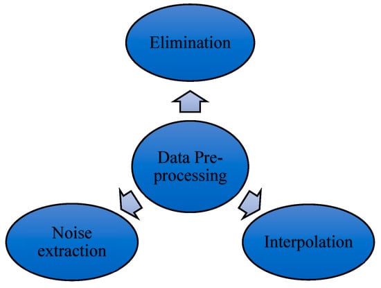 In smart grid, the data are collected through smart meters installed at the consumer’s end, the distribution transformer end, the substation end, and the generation end. In accordance with the method used, different datasets are collected from smart meters over different time horizons (e.g., 15 min, 30 min, 1 h, 1 day, 1 month, and 1 year). However, when compiling the dataset, it is not necessary to obtain the complete data at each time point; sometimes there may be missing data in the dataset for any duration, sometimes there may be outliers which overshoot or undershoot the dataset, and sometimes there is huge elimination of the dataset due to technical reasons. Therefore, in order to pre-process the dataset, various methods such as elimination, interpolation, and noise extraction are employed (Figure 2).