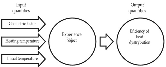 The results presented in papers [4,7,23,24,25,26,41,42,43,44] allowed for the selection of three input quantities, which contributed to the heat distribution efficiency in the PCMs and composites: the geometric factor (-); the PCM specimen’s initial temperature (°C); and the PCM specimen’s heating temperature (°C). In turn, ’Heat distribution efficiency’ was assumed as the output quantity for the experimental design. The geometric coefficient of these tests was defined as the ratio of the lateral area of the sample to its volume. The choice of the input quantities is the result of preliminary research and a review of the state of the art. The geometry of the PCM heat accumulator and the temperature range prevailing in the place of its application will affect the effectiveness of its phase change. A graphical diagram of the experimental design is shown in Figure 1.