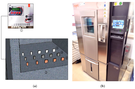 (a) Layout of the test specimens and data logger during testing; 1—data logger; 2—test chamber interior; 3—specimens of pure PCM; 4—specimens of PCM with coke recyclate; 5—specimens with PCM and a copper/polymer matrix; (b) Espec climate test chamber.