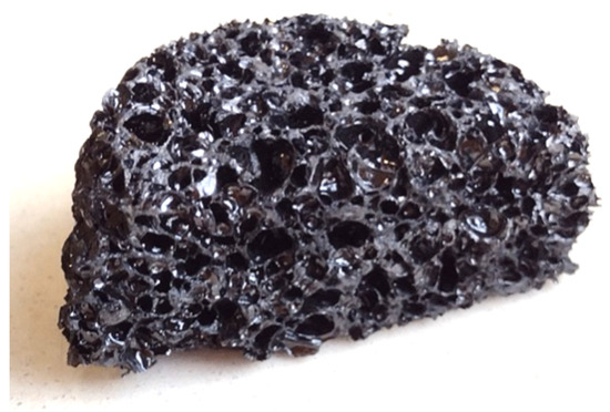 The PCM was applied to the reference specimens in its liquid state after the polymer matrix was produced. In contrast, the preparation of the test specimens with copper began with the fabrication of a copper mesh framework with a mesh diameter of 2 mm, coating it with a polymer film, followed by the application of liquid PCM. The last group of composites contained the coke recyclate and was cut from a recycled lump to produce the test specimens. An important property of the recyclate was its porosity; itdetermined the potential amount of PCM in the composite. The porosity value of the obtained recyclate was determined by comparing the density before and after grinding several randomly selected samples. The pore size was determined organoleptically and by SEM. The tests confirmed the porosity of the recyclate to be in the range of 66–70%. A photograph of the dissected lump of coke recyclate is shown in Figure 3.