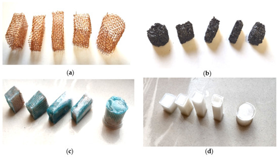 (a) Copper frameworks of the test specimens; (b) Cut shapes of the coke recyclate; (c) Finished test specimens with copper, PCM and the polymer matrix; (d) Finished test specimens with PCM and the polymer matrix.