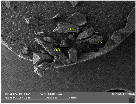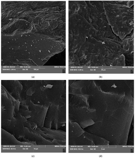 The manufacturing process of coke affects its structural and textural character. Using SEM techniques, the surface topography of the investigated material was obtained, the nature of the microstructural surface was identified, and the three-dimensional distribution of the individual components was observed. The microstructural surfaces of the coke recyclate was analyzed in three areas (Figure 6). Images of the resulting microphotographs, recorded at magnification of 100, 50, 10 and 5 µm (Figure 7), revealed a massive microstructured nature of the surface. The topography of the recyclate surface showed a burr-like, uneven character of the fracture, locally corresponding to conchoidal fracture (Figure 7c,d). Previous observations of the test material revealed a local presence of oval-shaped porous voids, up to 100 µm in diameter, which were empty.
