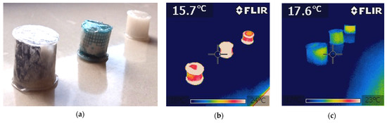 After the required shapes of the coke recyclate were cut out, the cuts were exposed to injection soaking with the liquid PCM at 60 °C for 12 h. After soaking with the PCM, following by cooling to 17–18 °C, the test specimens were coated with a polymer film, identically to the previous two specimen types. The finished test specimens were heated several times to test them for leaks before the actual experimental testing began. Figure 4 shows the photographs of the test specimens during their fabrication and in the finished state.