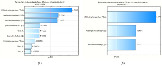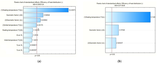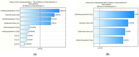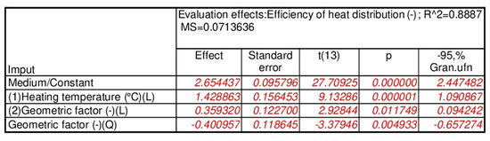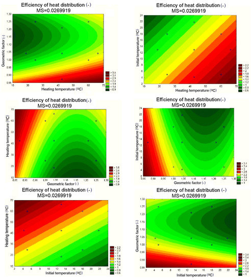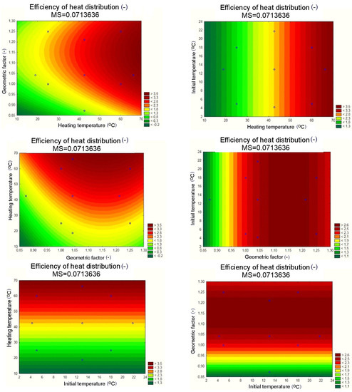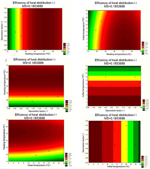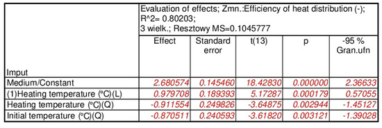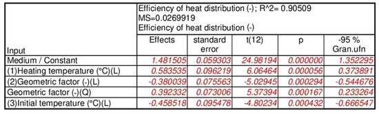 The results of the statistical analysis proved—with an assumed significance level of p=0.05 and satisfactory values for the error and determination coefficients of each heat accumulator tested—that the variability of the input quantities was statistically significant for the value of the calculated heat distribution coefficient. Accordingly, the following were statistically significant: (i) for the pure PCM heat accumulators—heating temperature, shape factor and shape factor correlation; (ii) for the PCM/coke recyclate heat accumulators—heating temperature, geometric factor, geometric factor correlation and initial temperature of the specimens; and (iii) for the PCM/copper conductor heat accumulators—heating temperature, heating temperature correlation and the initial temperature of the specimens.