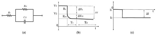 A conventional method to measure the internal resistance of a battery from the voltage change while taking the DC load from the battery, it is also termed as DCIR. In the literature, many phenomena are identified that contribute to this drop in voltage, and each of them is shown at a different frequency band. Figure 1a shows the Randles’ battery model. In Figure 1b, there is an instantaneous voltage drop due to pure ohmic resistance RS; in the first few seconds, the drop in voltage is due to charge transfer resistance Rct and double layer capacitance Cd; the voltage drop in the last few seconds is due to the polarization resistance and the decrease in SOC in the case of discharging [].