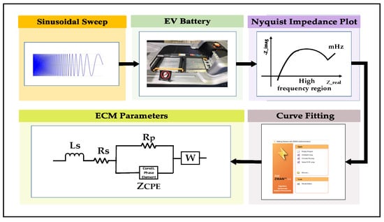 EIS is a widely used tool as it provides detailed insight into the internal electrochemical processes of the battery. Figure 2 shows the complete process of EIS to measure the ohmic resistance Rs. The sinusoidal sweep is generated over a broadband frequency range to perturb the battery, and response to the AC perturbation is acquired []. The battery response obtained is processed to calculate the impedance spectrum. Later, the curve fitting is applied to the impedance spectrum to extract the ohmic resistance Rs and the other ECM parameters such as inductance Ls, charge transfer resistance Rd, constant phase element ZCPE, and Warburg impedance Zw [].