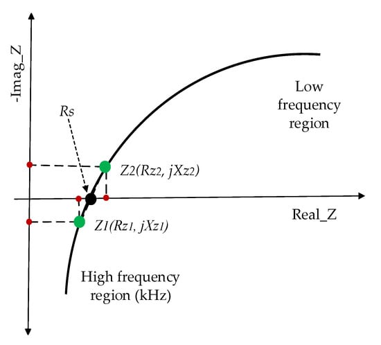 where , , , and are the real and imaginary components of the selected impedance Z1 and Z2, respectively. An arbitrary impedance on the straight line between and is . If then . Therefore, the equation for the ohmic resistance Rs is given by Equation (13).