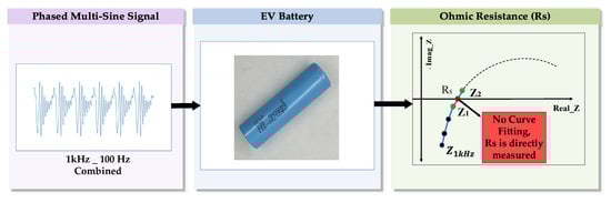 In Figure 5, the procedure of the proposed technique is described. Comparing it with the procedure followed by the conventional EIS method (as shown in Figure 2). It is pointed out that no curve-fitting procedure is required for the proposed technique. Rather, Equation (13) is used to directly calculate the ohmic resistance of a battery. Along with this, a phased multi-sine signal is used to perturb the battery for a specified frequency band (1 kHz to 100 Hz), which makes the measurement speed of the proposed technique multi-times faster than those of the conventional EIS methods.