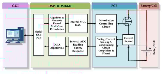 In Figure 6, the block diagram of the hardware setup is given. The main hardware consists of the DSP (FRDMK64F), the perturbation-controlling circuit, sensing and conditioning circuit. The hardware is controlled by the PC using the graphical user interface (GUI) developed in LabVIEW. It is connected to the PC through a USB cable. As the START button is clicked on the GUI, a phased multi-sine signal is generated using a 12-bit internal DAC. The battery perturbation current flowing through the MOSFET is controlled by the phased multi-sine signal applied at the gate. The battery response (voltage and current) is read by the internal ADCs connected to the sensing and conditioning circuit [].