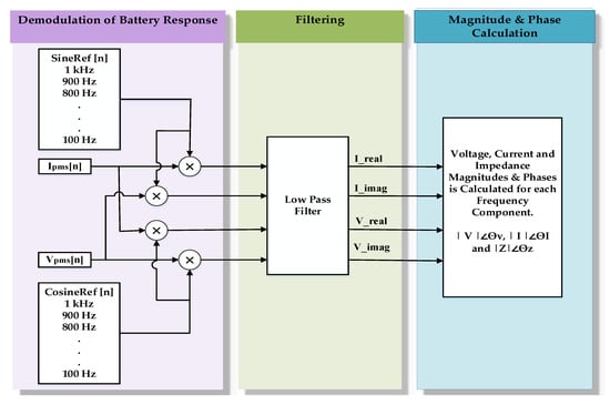 In Figure 7, the block diagram of the digital lock-in amplifier (DLIA) is given. The DLIA algorithms are divided into three sections. In the first section, the battery response is demodulated by mixing it with reference sine and cosine signals. During the second section, a low-pass filter is applied to extract the in-phase and quadrature components at the specified frequency. In the last section, the magnitudes and phases of the current, voltage, and impedance are calculated.