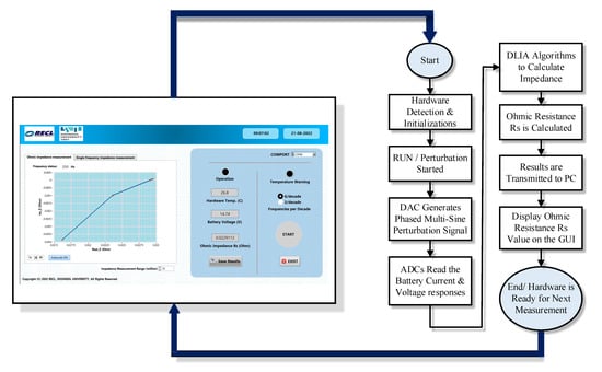 The flowchart of DSP codes for ohmic resistance measurement and LabVIEW GUI is shown in Figure 8. The hardware is detected by LabVIEW GUI through serial port COM. The starting command is sent from GUI to the DSP which generates a phased multi-sine perturbation, and the battery response is readback through ADCs. The DLIA algorithms processed the response of the battery and ohmic resistance Rs is calculated. Results obtained are send to the PC and displayed on the GUI.