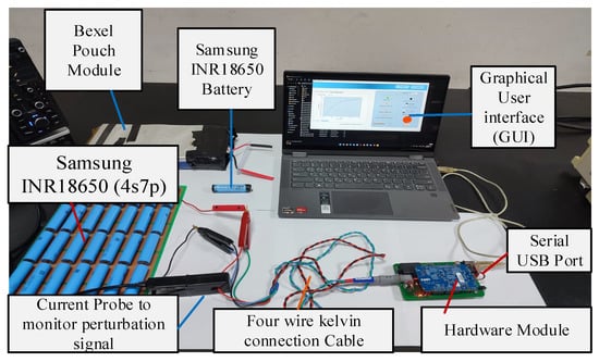 In this method, a 1 kHz AC signal represented by Equation (3) is applied to perturb the battery, and the corresponding impedance is calculated by using Equation (4) [,].