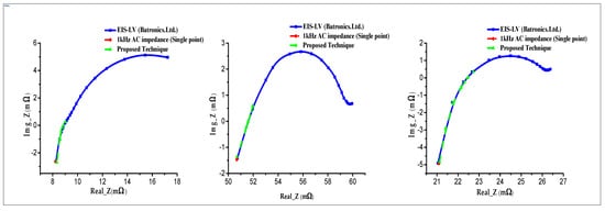 In this section, the discussion on the accuracy and validity of the proposed technique is carried out. To verify the accuracy and validity of the proposed method, the results measured are compared with those of the available commercial EIS instrument known as LVEIS manufactured by Batronics Co. Ltd. (Seoul, S.Korea) []. Three lithium-ion batteries are tested in the experiment, the experimental setup and the specifications of the batteries are shown in Figure 9 and Table 3 [], respectively. The ohmic resistance of the mentioned batteries is measured through the 1 kHz AC signal method, LVEIS by Batronics Co. Ltd., and the proposed technique. The results recorded from the experiment are plotted and listed in Figure 10 and Figure 11, Table 4 and Table 5, respectively.
