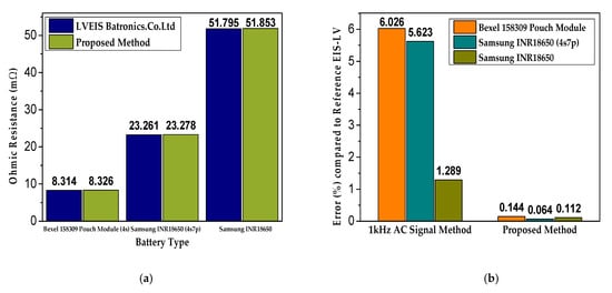 (a) Comparison of ohmic resistance measured by the proposed technique and commercially available EIS instrument (LVEIS by Batronics Co., Ltd.); (b) percentage (%) error comparison of 1 kHz AC impedance method and the proposed technique with reference commercially available EIS instrument (LVEIS by Batronics Co., Ltd.).