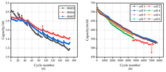 Two public datasets published by NASA PCoE and the University of Oxford, respectively, have been used to analyze aging properties and develop SOH estimation models for lithium-ion batteries. The 18650 cylindrical cells used in the NASA dataset are rated at 2 Ah and charged, discharged, and impedance tested at room temperature. The charging process uses a constant current of 1.5 A to 4.2 V, followed by a constant voltage of 4.2 V to continue charging until the charging current is less than 0.2 A. The discharge process uses 2 A for constant discharge so that the lithium-ion battery repeatedly accelerated aging until the battery reaches 30% of the initial capacity (EOL). The Oxford Battery degradation dataset uses 8 lithium-cobaltite bagged batteries with a rated capacity of 0.74 Ah. The batteries are repeatedly aged through constant current and constant voltage charging and discharge process in urban driving conditions of ARTEMIS at a constant ambient temperature of 40 °C. The two datasets include voltage, current, and temperature information during the charging and discharging process. As shown in Figure 1, the aging curves are inconsistent under the same aging test conditions for the batteries in the two datasets due to subtle differences in the internal materials and structures.