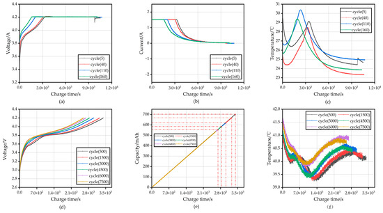 The charging curves of different cycles: (a) The voltage curves of B0006; (b) The current curves of B0006; (c) The temperature curves of B0006; (d) The voltage curves of Cell 1; (e) The capacity of Cell 1; (f) The temperature curves of Cell 1.