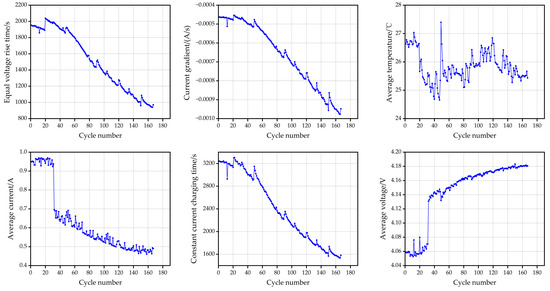 It is evident from Figure 2a,d that there is a clear difference in the moment when the voltage of different cycles reaches its peak (4.2 V) during the constant current charging phase. The higher the aging degree, the shorter the time required, which directly reflects the reduction of the available capacity of the battery at this time. As shown in Figure 2b, in the constant voltage charging process of B0006 battery, the initial current drops rapidly, and the gradient of the charging current drops sharply at this time, and then the gradient of the charging current drops slowly. With the increase of the cycle times, the gradient of the charging current drops more rapidly. It should be noted that the Oxford aging dataset battery only records the constant current charging phase. Therefore, we only extracted the CC charging stage for the Oxford dataset. As can be seen from Figure 2c,f, during the whole charging process, the peak temperature of the battery does not have an obvious rule but the average temperature increases with the increase of charging and discharging times, which also corresponds to the internal mechanism that the aging degree of the battery increases, its internal resistance increases, and the heating becomes more obvious. It can also be seen that the time when the battery reaches the peak temperature becomes earlier with the increased number of cycles. From the above analysis, six indicators can be selected as battery health factors: equal voltage rise time, constant current charging time, average charging current, peak temperature, current drop gradient at constant voltage stage, and average charging voltage. Considering the actual operating conditions, the charging time from 3.8 V to 4.1 V is selected as the constant voltage rise time. The average charging current and current drop gradient at the constant voltage stage are only extracted for the NASA dataset. Figure 3 shows the relationship between health factors and cycles after normalization of NASA dataset.