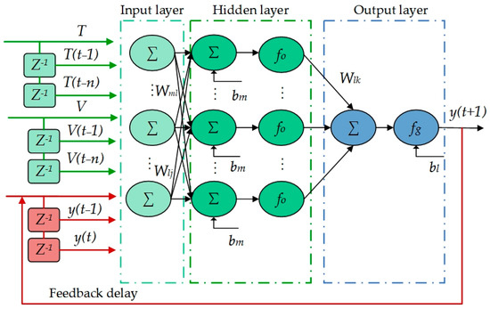 where and represent the activation functions of the output layer and the hidden layer respectively; and represent the weight and bias between the corresponding layers; and represent the input and output delay elements.