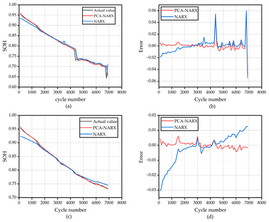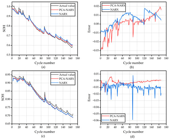 In this section, the influence of PCA is analyzed first. The PCA-NARX and a simple NARX neural network are compared. For NASA dataset, B0005 is used to train the neural network and then B0006 and B0007 are used to test the trained model. Figure 5 shows the SOH prediction results of B0006 and B0007 using the PCA-NARX and NARX neural networks, respectively. The input of the PCA-NARX neural network are the first three principal components of Table 1, while the NARX neural network uses the original sequence of six health factors without PCA, and the output of both are battery SOH. In addition, Figure 6 shows the SOH prediction results of Cell 2 and 3 using the PCA-NARX and NARX neural networks. The MAE and RMSE are summarized in Table 2.