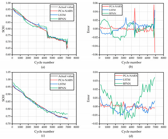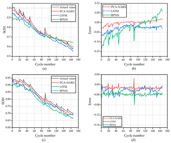 To validate the accuracy of the proposed model for SOH estimation, the proposed PCA-NARX model is compared with the BPNN and LSTM models. The BPNN and LSTM neural networks are trained in the same way, including the PCA pre-processing, number of hidden neurons, and number of training epochs.