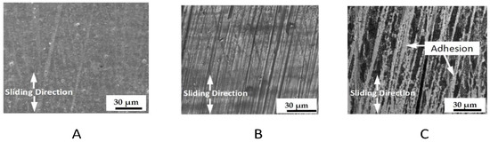 A marine low-speed engine is used as a ship’s main propulsion, so keeping the engine in a good technical condition is a topic of high importance for owners and operators. During the operation of such engines, the excessive wear of cylinder liners (CLs) and piston rings (PRs), and problems associated with scuffing frequently occur. Statistically, such failures cause the highest proportion of all the recorded marine low-speed engine breakdowns. The failure and malfunction of cylinder liners or piston rings are very dangerous for the safety of vessels, the environment, and the people on board, and they deteriorates the overall performance of the engine [1]. The reliability of an engine’s components is an extremally important subject for ship operators, as it influences the efficient operation of the vessel. Trends in the reduction of cylinder oil feeding rates have been observed, but without a consideration of differences among various engine types and sizes, various types of engine operating conditions, and the service lives of cylinder liners and piston rings, etc. To avoid operational problems with cylinder liner or piston ring failures, it is necessary to frequently conduct assessments of the condition of the cylinder liners and piston rings. The tribology of cylinder liners and piston rings in combustion engines has been studied by researchers for many decades. Research has also been performed specifically on marine low-speed diesel engines. Several attempts to simulate the wear and scuffing behavior by rig testing have been previously presented [2]. A theoretical study of piston ring wear in large two-stroke engines was presented by Rodríguez and co-authors [3]. The modeling of piston rings wea was presented by Yuelan and co-authors; this study presented the results of a simulation of piston ring and cylinder liner motion, performed on an SRV 4 temperature-, friction- and wear-testing machine. They observed that the Cr-plated piston ring and cylinder liner wear process is mainly abrasive. When the load increases, serious abrasive wear and adhesive wear take place, due to the emission of heat in the friction phenomena. When relative motion happens between two materials, adhesive wear takes place by plastic deformation under contact stress at a high load; this transfers from one surface to another surface and forms a transfer film on the grinding surface after continuously reciprocating the friction, scuffing, adhesion and peeling [4]. Figure 1 presents the morphology of the wear scars of Chromium-plated piston rings obtained by Yuelan.