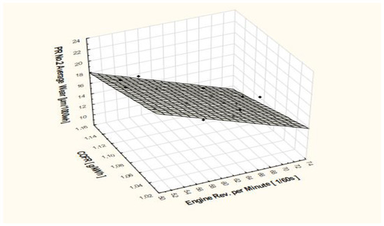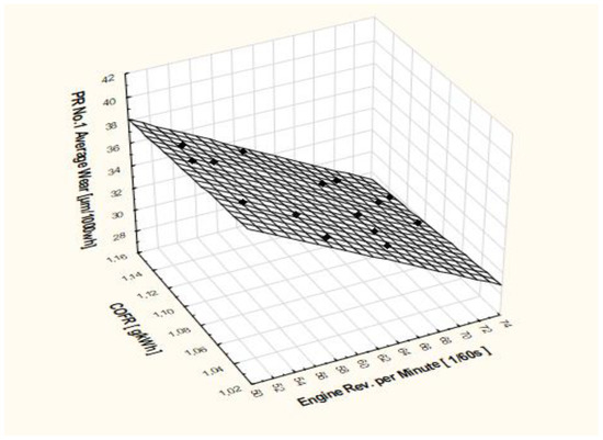 It was found that, when the piston speed decreases to 6.0 m/s or less (it corresponds to the engine’s 55 RPM), the piston ring wear rates increase significantly. This is visible in Table 1, Table 2 and Table 3, which concern all the piston rings on all the tested engines. Using statistics, this study found that the most essential factors for piston ring coating wear rates are the cylinder oil feed rate, the engine’s load and the engine speed/RPM. The engine RPM and COFR are factors that are available anytime when needed for engines installed on ships. The engine load, which is a more difficult factor to estimate on board vessels, has been omitted; however, the engine load is proportional to the engine’s RPM to a third power in normal operational conditions. All the data gained during the research performed on research test engines No. 1 and No. 2 and No. 3 were used with the aid of the program STATISTICA (license JPZ009K288211FAACD-Q); this was in order to find the piston ring wear rate mathematical prediction models, depending on the engine RPM and COFR. The program STATISTICA was used for regression analysis, in order to find the most accurate prediction model.